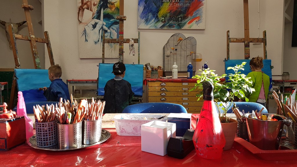Wir haben uns dann schließlich für eine Malschule entschieden, nur 15 Gehminuten von unserer Wohnung entfernt. Und das war auch wirklich eine sehr gute Wahl. Die Kinder hatten dort zwei Stunden Zeit um unter Anleitung von zwei sehr kompetenten Studentinnen einen Delfin oder einen Hai auf Leinwand zu malen. Jedes der Kinder wurde, in einen Malkittel gepackt und vor eine Staffelei gestellt. So zauberten sie Schritt für Schritt einen kleinen Meeresbewohner aufs Blatt. Erstaunlicherweise waren die sieben Zwerge alle sehr konzentriert bei der Arbeit und konnten stolz ihr Endprodukt bestaunen. Während zweier Pausen wurden Muffins verdrückt, ein Geburtstagsständchen vorgetragen und die Geschenke ausgepackt. Die getrockneten Bilder werden wir dann in den kommenden Tagen aus der Malschule abholen und hoffentlich finden die Kunstwerke in den Kinderzimmern einen schönen Platz an den Wänden.