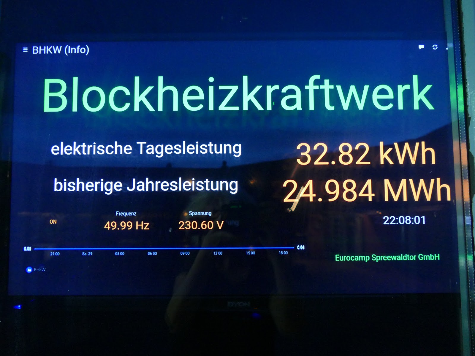 Anette erklärt mir, dass das neu errichtete Schwimmbad und die Sauna über ein hauseigenes Blockheizkraftwerk beheizt wird. Das Blockheizkraftwerk wird mit Gas betrieben und erzeugt Strom. Statt die hieraus entstandene Wärme verpuffen zu lassen, wird sie zur Erwärmung von Schwimmbad und Sauna genutzt. Die Stromversorgung der Sanitäranlagen wird außerdem zu 70 % über die auf den Dächern installierten PV-Anlagen gewährleistet. Die PV-Paneele wurden schon 1992 auf die Dächer montiert, als die Gemeinde Groß Leuthen den Campingplatz mithilfe Gelder aus dem Europäischen Fonds für Regionale Entwicklung errichten ließ. Seit der Übernahme durch Familie Weber läuft der Platz, nach eigenen Angaben, richtig gut.